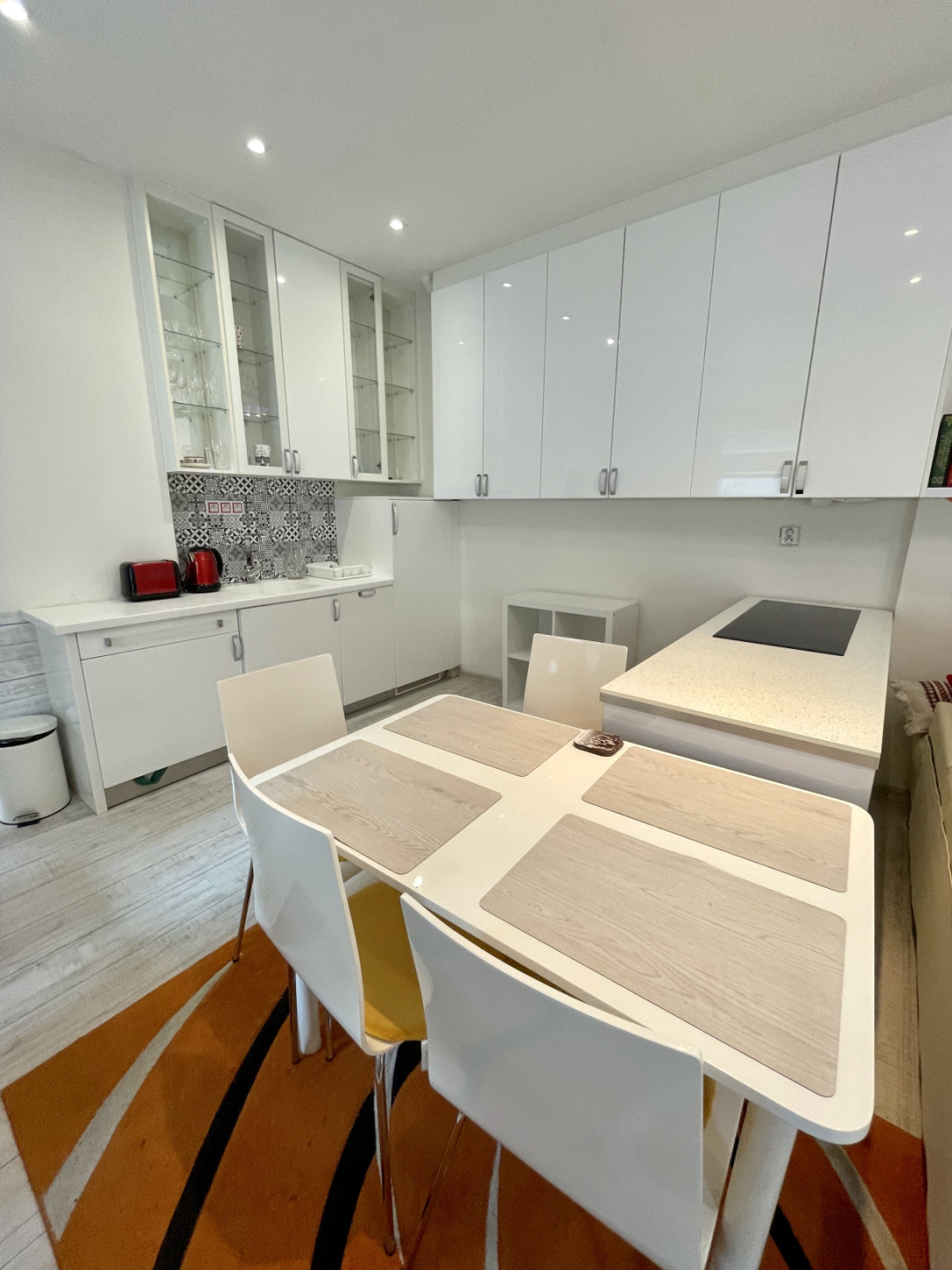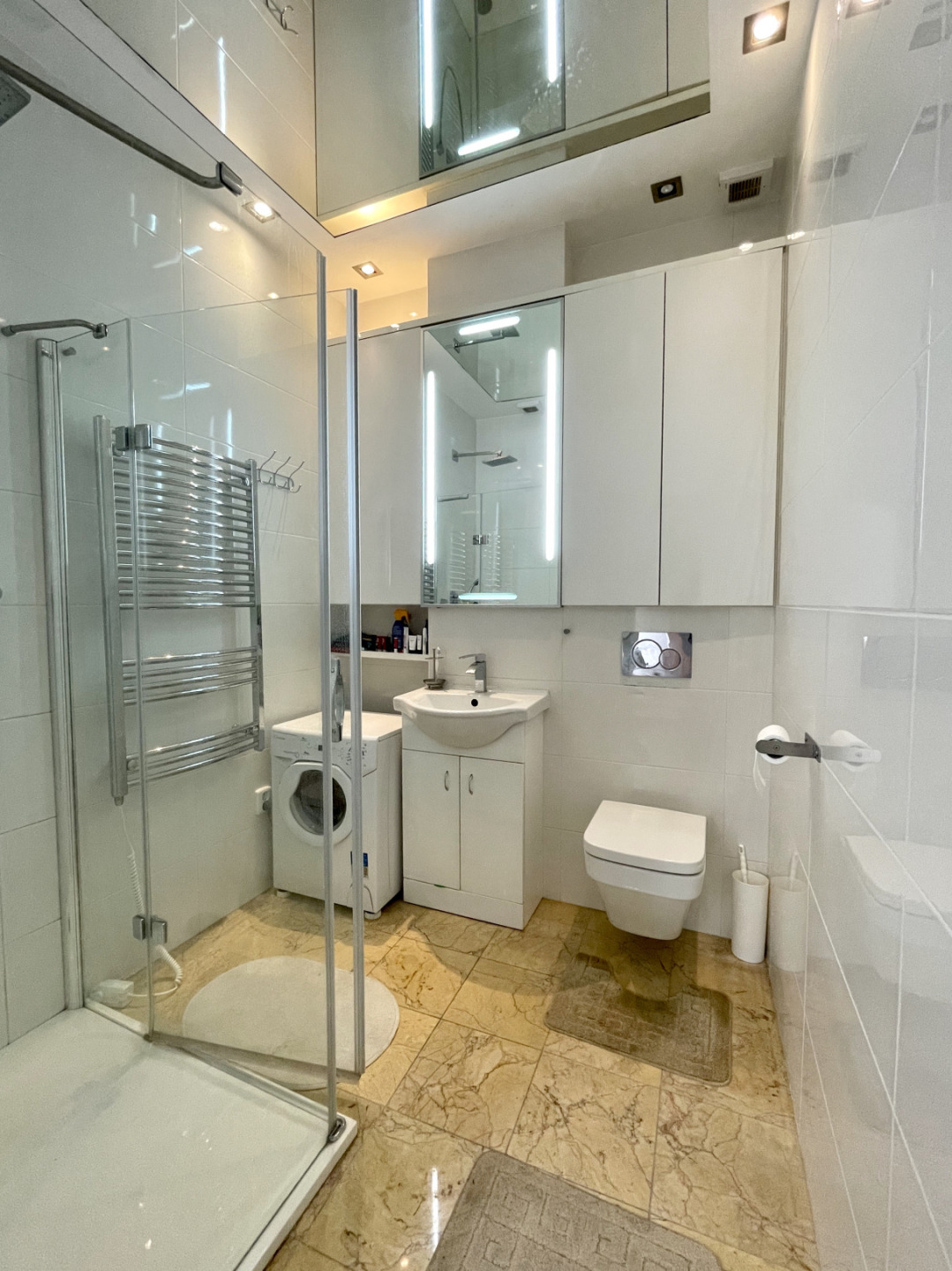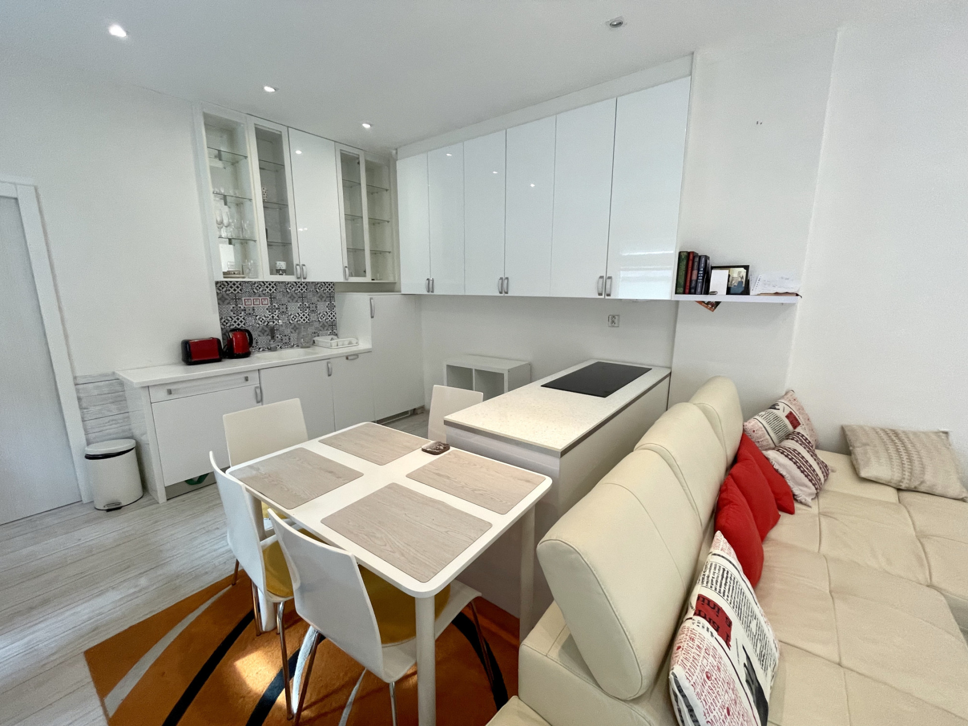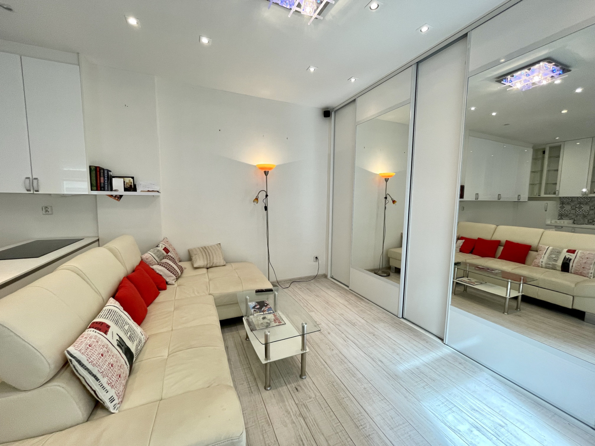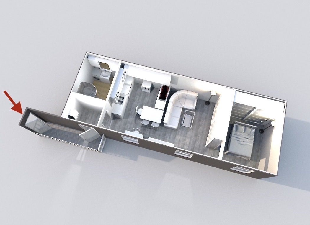 Sestává z obývacího pokoje s kuchyňským a jídelním koutem, ložnice, koupelny, předsíně a balkonu. Je zařízený nábytkem na míru s úložnými prostory a vybavený spotřebiči. V pokoji je kuchyňská linka, myčka, lednice, kuchyňský ostrůvek s el.varnou deskou, pečící a mikrovlnnou troubou, jídelní stůl se židlemi. V obytné části je rohová sedačka, konferenční stolek, zrcadlové skříně, prádelník a psací stůl se židlí. V ložnici dvojlůžko a vestavěná skříň. Všechna okna směřují na jih do dvora. Koupelna se sprchovým koutem, toaletou a pračkou. Vstup do bytu přes pavlačový balkon patřící k bytu. Vytápění a ohřev vody vlastním el.kotlem.