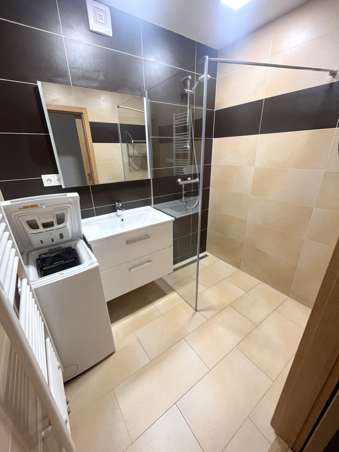 Byt je ve výborném stavu a nabízí se zařízený pouze s kuchyňskou linkou se spotřebiči (lednice s mrazákem, pračka, ele.troubou a sklokeramickou deskou). Koupelna se sprchovým koutem, WC samostatné.